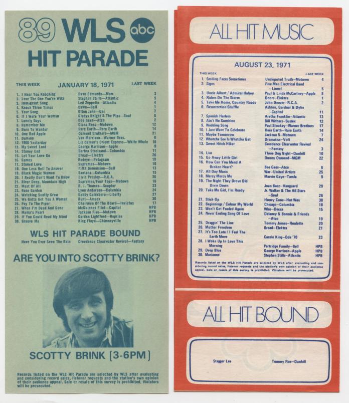 WLS Chicago Surveys from 1/18/71 and 8/23/71. Photo is courtesy of Pete Battistini: Author of the book, American Top 40 with Casey Kasem (The 1970’s).