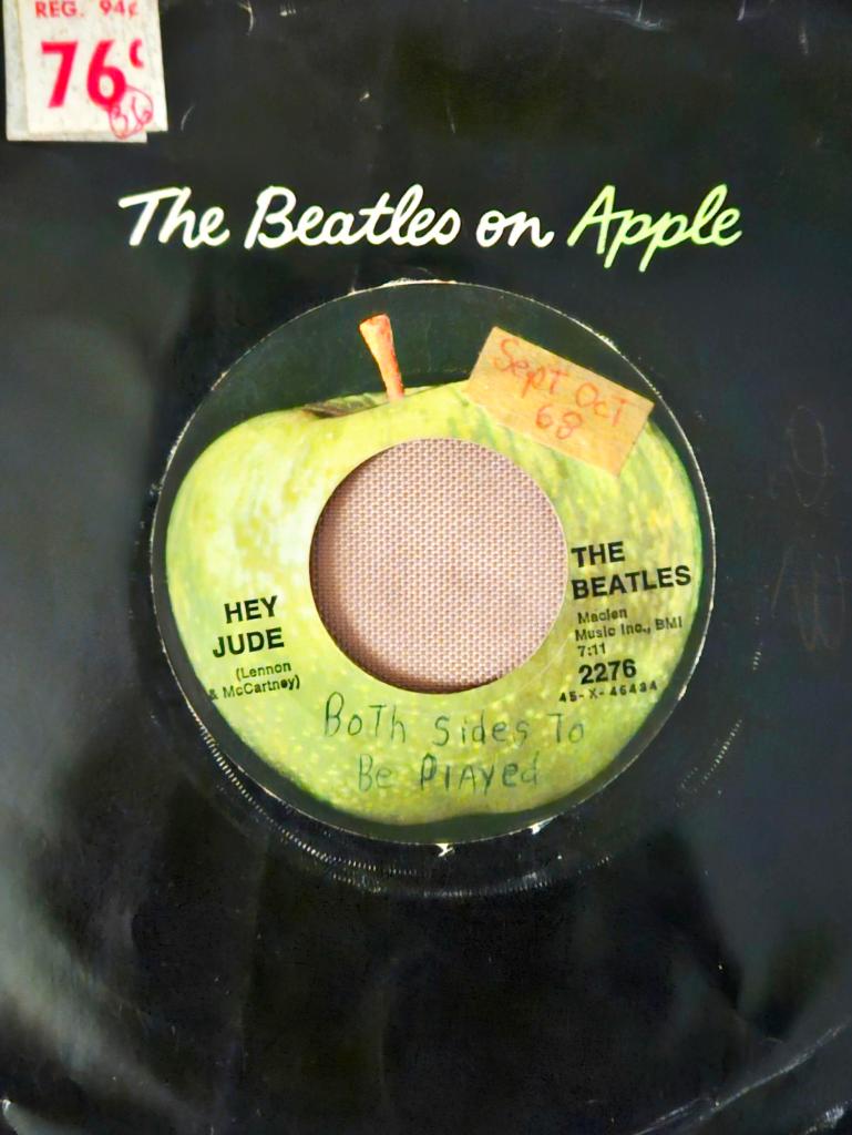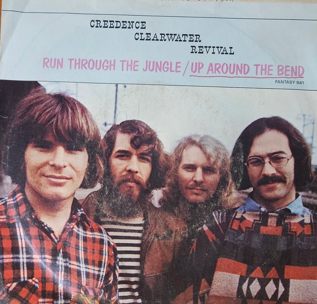 Photo of the record sleeve of my Double-A-sided 45-rpm “Up Around the Bend” and “Run Through the Jungle” that I bought in May 1970. These two songs were hits, and I still own the record here in 2025.