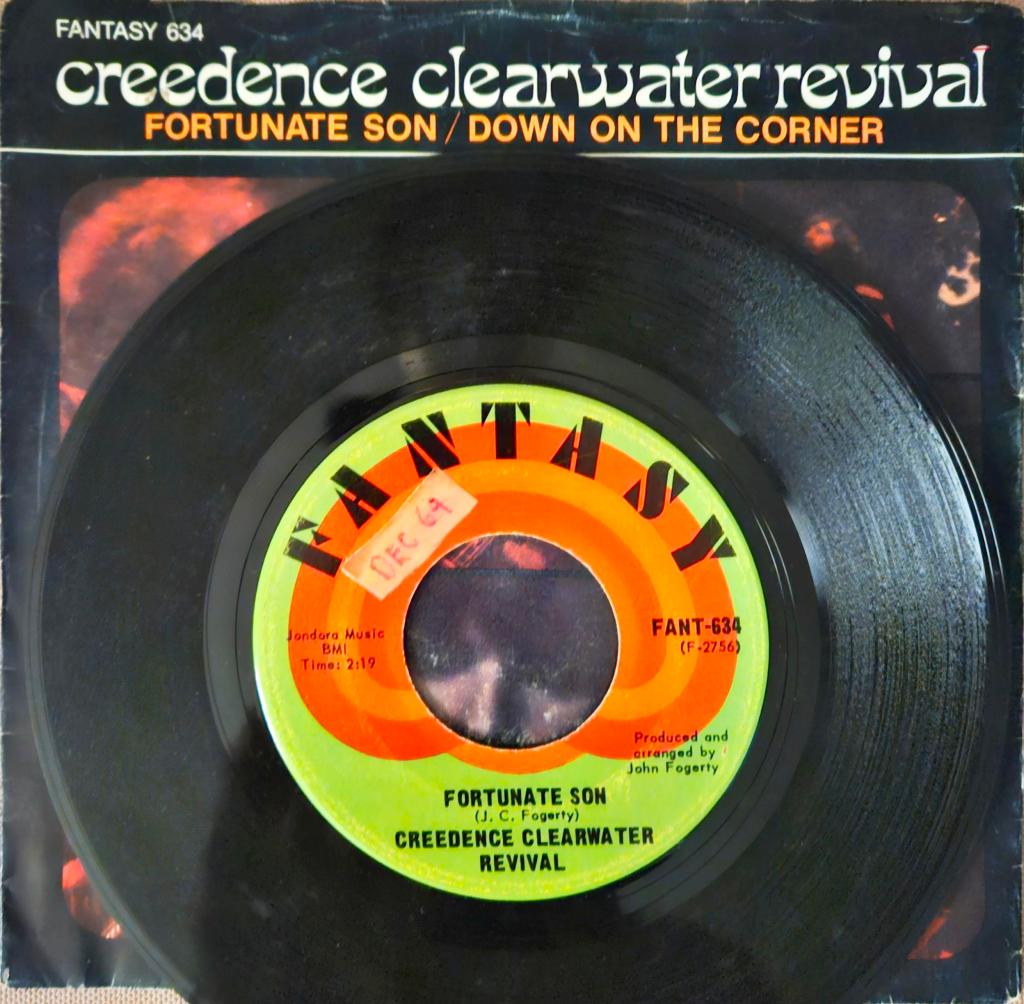 My 45-rpm single of “Fortunate Son” and “Down on the Corner” that I bought in the fall of 1969 and still own this record here in 2025.