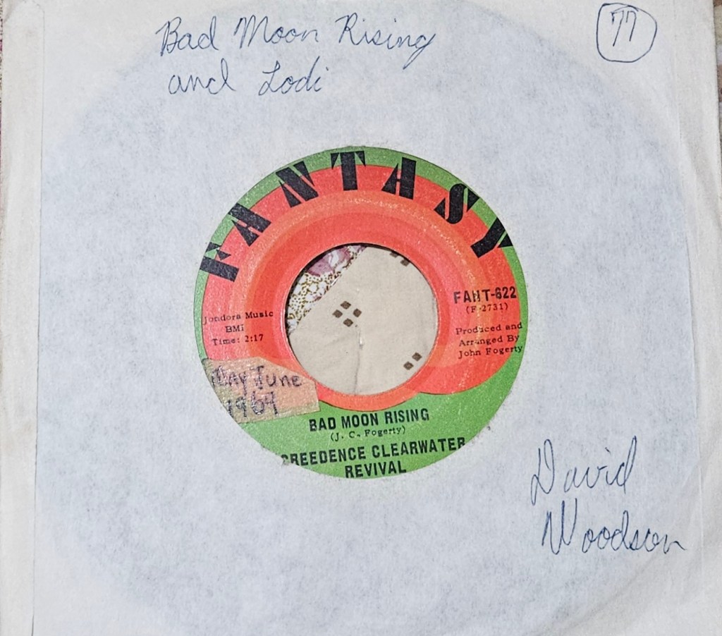 Photo of my Double-A-Sided 45-rpm “Bad Moon Rising” and “Lodi” single that I purchased back in the summer of ’69 and that I still own here in 2025.