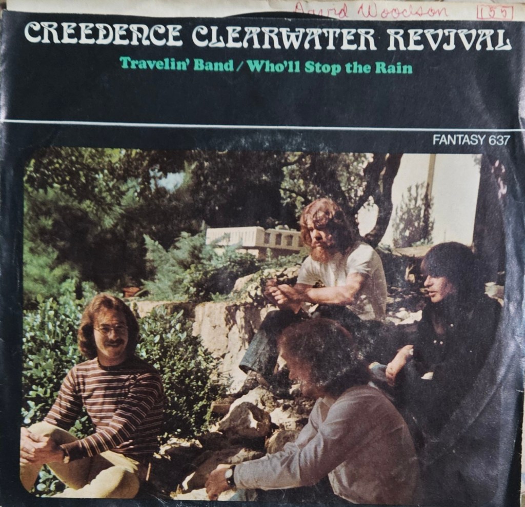Photo of the record sleeve of the Double-A-sided 45 rpm “Who’ll Stop the Rain” and “Travelin’ Band” single that I bought during the winter of 1970 and I still own the record here in 2025.